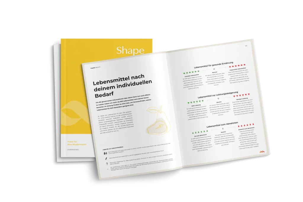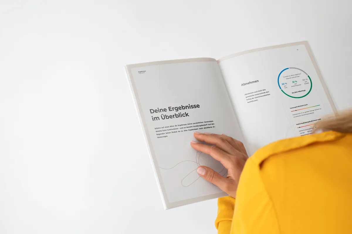 Nach der Analyse deiner DNA erhältst du einen ausführlichen Ergebnis-Bericht. Er enthält detaillierte und leicht verständliche Informationen zu deinen genetischen Prädispositionen, praktische Handlungsempfehlungen und eine umfangreiche Lebensmittelliste. Außerdem findest du transparente wissenschaftliche Erklärungen, welche Rolle deine Gene im Hinblick auf dein Gewicht und deine Ernährung spielen.
